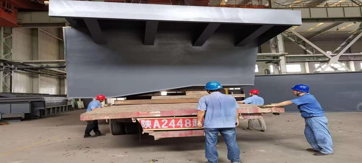 由于該項(xiàng)目鋼箱梁中的疊合梁數(shù)量較多,不僅內(nèi)部結(jié)構(gòu)復(fù)雜,而且外部形狀極不規(guī)則,裝車發(fā)運(yùn)難度較大。為此,陜重公司的運(yùn)輸公司,超前工作,在鋼箱梁的加工制作過程中,就提前深入到生產(chǎn)車間和現(xiàn)場,進(jìn)行跟蹤,全面收集、匯總、計(jì)算鋼箱梁各部位的尺寸變化,再根據(jù)運(yùn)輸?shù)能囆?,選用安全牢靠的鋼材,設(shè)計(jì)、制作運(yùn)輸工裝,并首此采取了鋼箱梁"先在廠內(nèi)試運(yùn),確認(rèn)運(yùn)輸安全后,再正式裝車發(fā)運(yùn)出廠"的安全運(yùn)輸方案,確保了400多塊鋼箱梁的正常安全運(yùn)輸。